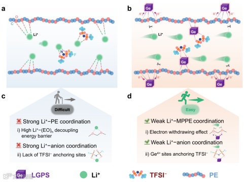 (1)新型“微环境调控”电解质设计:作者提出了一种区别于传统聚合物结构改性的新型策略——通过在聚醚电解质中引入Ge4+位点,调控聚合物主链周围的局部微环境。该方法不依赖复杂的聚合物分子结构设计,具备工艺简便、适应性强等优势,为突破固态聚合物电解质中Li⁺迁移能垒问题提供了新的解决路径。