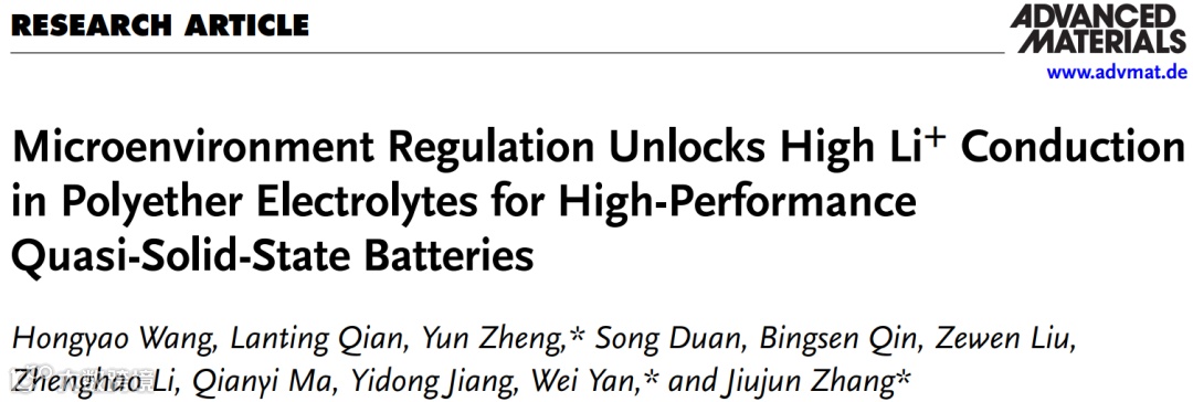 H. Wang, L. Qian, Y. Zheng*, S. Duan, B. Qin, Z. Liu, Z. Li, Q. Ma, Y. Jiang, W. Yan*, J. Zhang*. “Microenvironment Regulation Unlocks High Li+ Conduction in Polyether Electrolytes for High-Performance Quasi-Solid-State Batteries”, Adv. Mater., 2025, e10197.
