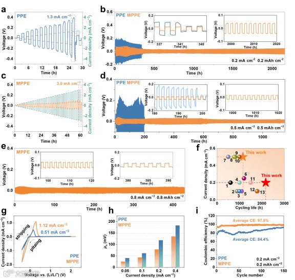 图4. Li|MPPE|Li对称电池和Li|MPPE|Cu半电池在25 ℃下的电化学性能测试。
