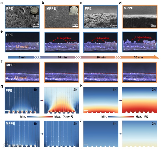 为了探究了预锂化设计在固态电池中的作用,以了解锂枝晶生长的情况,并阐明长期稳定性的潜在机制。作者对锂金属负极的形态特征和结构演变进行了详细研究。扫描电子显微镜(SEM)和原位光学显微镜观察证实,MPPE能引导锂金属形成致密、无枝晶沉积形貌。COMSOL多物理场模拟进一步揭示,MPPE可显著抑制局部电流聚集,实现均匀的锂沉积/剥离过程。