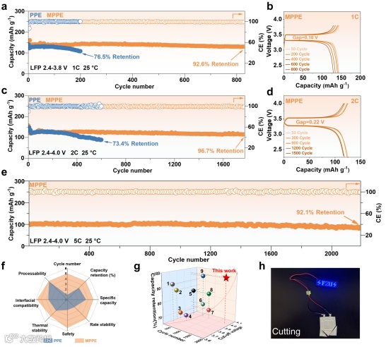 图6. “微环境调控”的MPPE在Li||LFP体系中表现出优异的倍率与循环性能