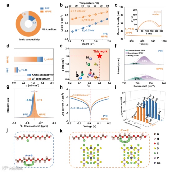 作者进一步对MPPE进行了基本的电化学性能测试。拉曼结果表明,“微环境调控”策略设计弱路易斯酸性的Ge4+位点促进了TFSI⁻阴离子解离,提高自由Li⁺浓度,从而使MPPE展现出优异的Li+导电性,室温下离子导电率达到1.83 mS cm−1,Li+迁移数高达0.8。DFT计算了MPPE中Li+在相邻EO之间的迁移能也更低(相较于对比样PPE),该研究从动力学模拟的角度为Li+传输的实验观察结果提供了理论依据。