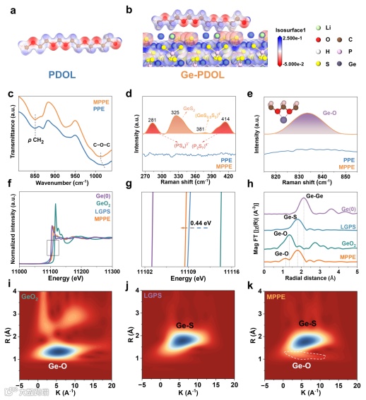 作者通过表面静电势模拟表明,在PDOL基电解质中引入Ge4+基材料可有效削弱EO的电子云密度。进一步结合傅里叶变换红外光谱(FT-IR)、拉曼光谱(Raman)及同步辐射技术对MPPE进行深入表征,证实了Ge4+与PDOL中EO之间存在吸电子效应。具体而言,Ge4+位点一方面削弱了Li⁺与醚氧之间的强配位,另一方面与EO形成了弱配位结构,从而实现对局部微环境的有效调控。该研究从分子模拟与实验表征两方面,为“微环境调控”策略提供了坚实的理论与实验证据。