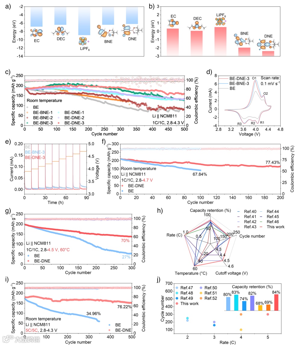 在分子设计策略下,作者筛选出含Lewis酸位点的环状硼酸酯BNE与DNE作为功能性添加剂。DFT计算显示DNE具更高的HOMO与更低的LUMO能级,利于优先参与界面反应。实验表明: 在4.7 V高压下循环200次后,添加3 wt% DNE的BE-DNE体系仍保持77.43%容量,而基线电解液(BE)已短路失效。 在60°C高温和5 C大倍率条件下亦表现出优异的容量保持和稳定性,凸显其广泛的环境适应性和界面耐久性。