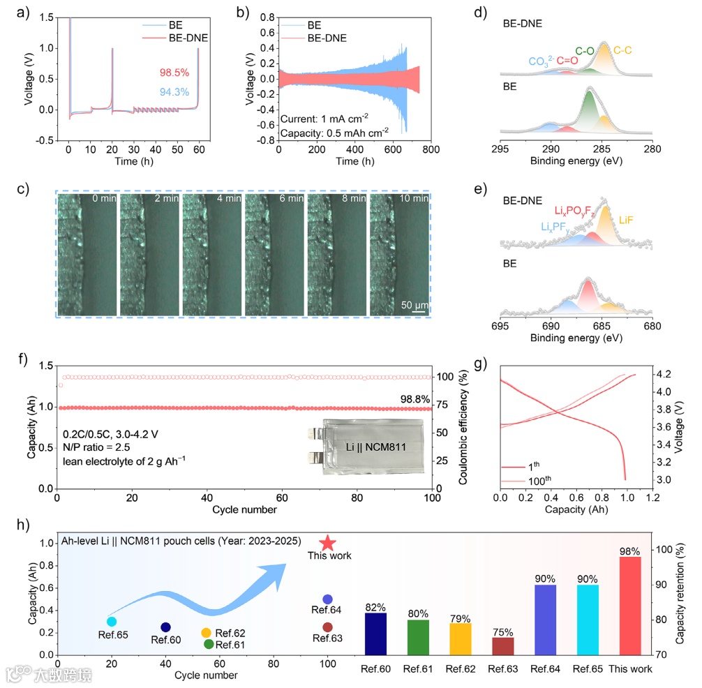 在负极端,DNE显著优化锂沉积行为: Li||Cu电池的库伦效率由BE的94.3%提升至98.5% Li||Li对称电池在600小时循环中电压极化明显减小 原位光学、电镜与AFM观察显示,BE-DNE体系中锂沉积更致密、均匀且无枝晶 SEI组分分析表明: BE-DNE形成的SEI中有机组分降低,无机LiF比例增加,利于离子传输与结构稳定 最终在工业化参数条件下(N/P = 2.5、2 g Ah⁻¹贫电解液)组装的1 Ah软包电池(能量密度331 Wh kg⁻¹),在100次循环后容量保持率达98.8%,优于大多数现有体系。
