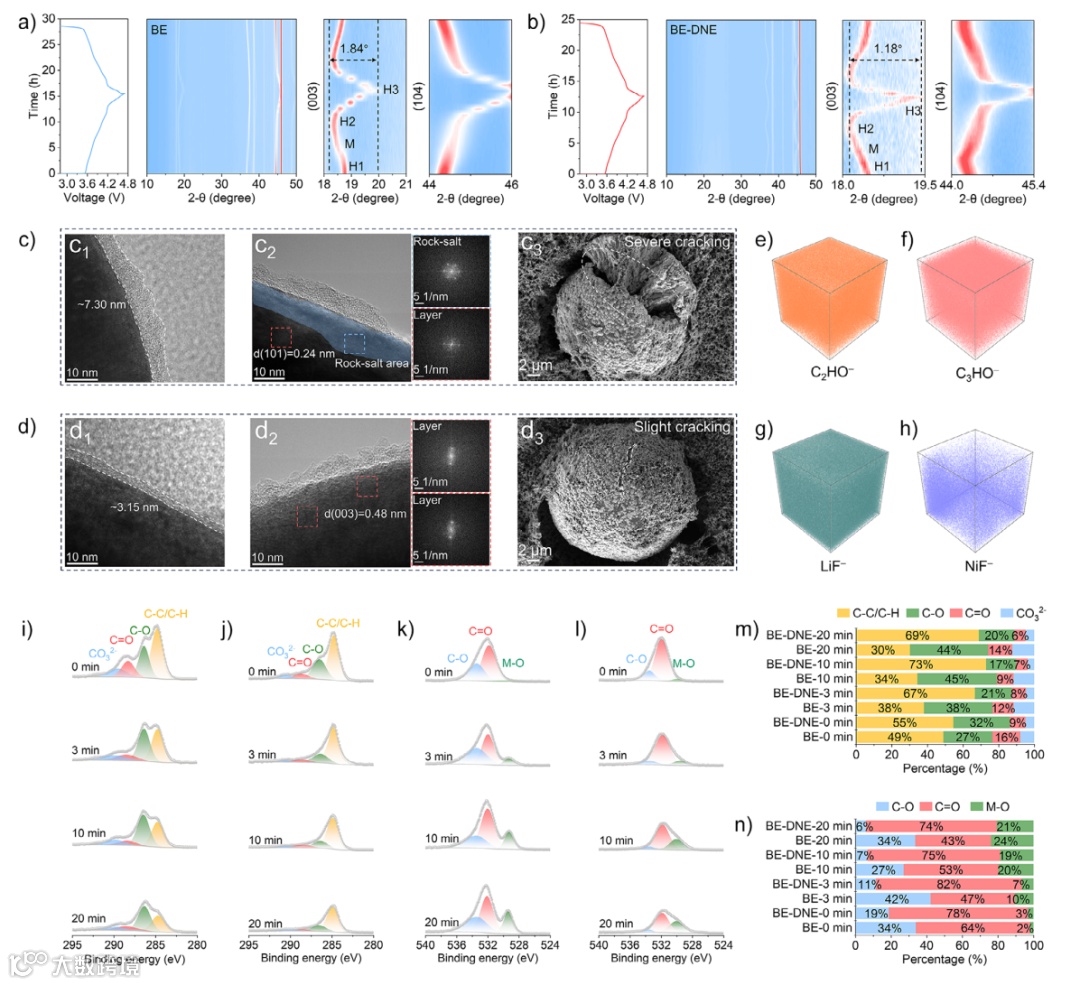 通过原位XRD跟踪NCM811正极的晶格变化发现: BE体系中晶胞体积变化幅度大((003)峰角度变化达1.84°),而BE-DNE体系仅为1.18°,表明其有效抑制了H2-H3相变所致的体积变化和颗粒应力。 进一步通过TEM与SEM观察: BE衍生的CEI厚且不均(7.3 nm),有大量岩盐相沉积;而BE-DNE形成的CEI更均匀致密,仅3.15 nm,且无显著结构转化。 TOF-SIMS与XPS深度剖析显示: BE-DNE形成的CEI呈现内层无机(LiF/B-F-rich)+外层有机结构,具备捕获Ni²⁺、Co²⁺、Mn²⁺等过渡金属的能力,显著抑制副反应与结构崩解。