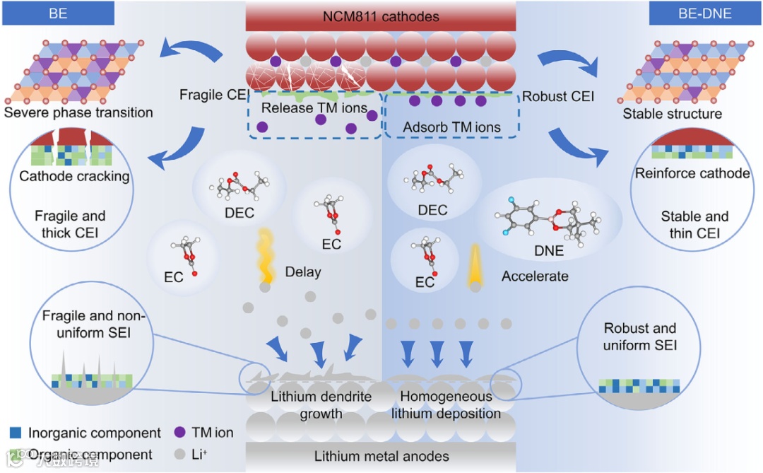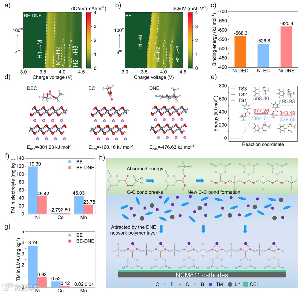 通过dQ/dV分析与DFT理论计算表明:DNE分子具有较强的Ni²⁺、Co²⁺、Mn²⁺结合能力,优于传统碳酸酯溶剂,优先吸附于NCM811表面。DNE在高压下发生C–C断裂并原位聚合,形成含Lewis酸B–O位点的聚合物网络,可螯合过渡金属离子。ICP-OES表明,BE-DNE中电解液与锂负极中溶解沉积的过渡金属显著减少,说明其从根源抑制了TM离子迁移与腐蚀。