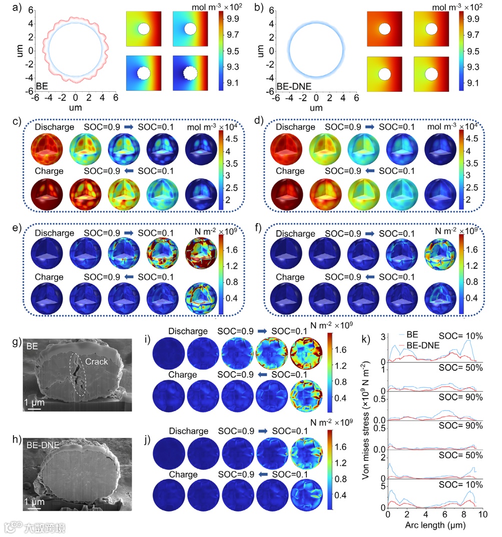 基于COMSOL多物理场模拟对CEI形成过程、Li⁺浓度分布与应力演化进行了可视化研究:BE-DNE系统在充放电过程中表现出更均匀的Li⁺浓度分布与稳定的CEI形貌,降低了浓度极化。BE系统中颗粒内部应力高度集中,易产生裂纹;而BE-DNE系统应力分布均匀,有效缓解应力集中。FIB-SEM实验证实BE-DNE循环后的正极颗粒无明显裂纹,验证了模拟预测。