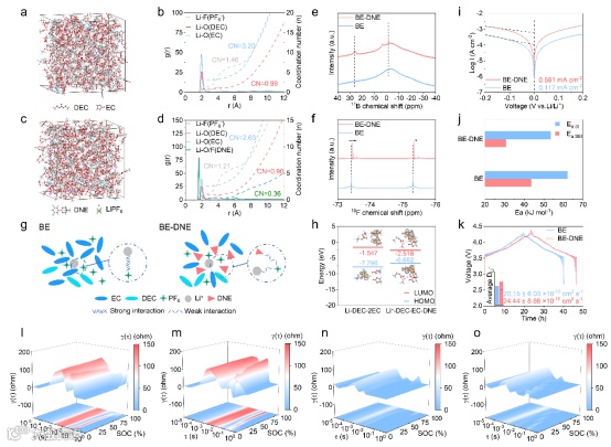 通过分子动力学(MD)模拟与多种核磁共振(NMR)和光谱表征揭示: DNE与PF₆⁻的结合能为–33.77 kJ mol⁻¹,表现出自发锚定阴离子的能力。 加入DNE后,Li⁺–PF₆⁻配位数由1.46降至1.21,Li⁺–EC/DEC配位减少。 11B NMR与19F NMR显示PF₆⁻发生高场位移,说明其被DNE锚定,从而重构了Li⁺溶剂化结构。 Li⁺迁移数从0.31提升至0.71,交换电流密度显著提高,界面动力学性能大幅改善。