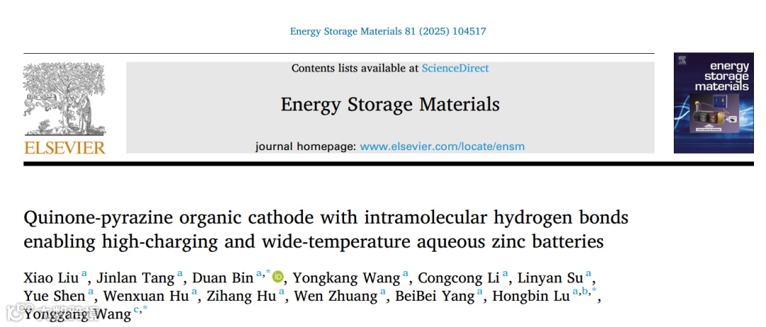 具有分子内氢键的醌-吡嗪有机正极可实现快速充电和宽温域的水系锌电池