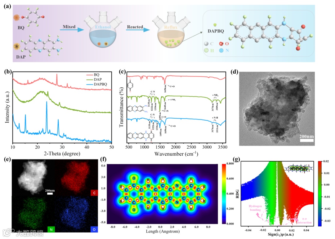 图1. (a)DAPBQ的合成过程;BQ、DAP和DAPBQ的XRD图谱(b)和FTIR图谱;DAPBQ的TEM图谱(d)和相应的元素分布图(e);(f)π电子局域化函数图;(g)显示DAPBQ分子间相互作用的RDG散点图。