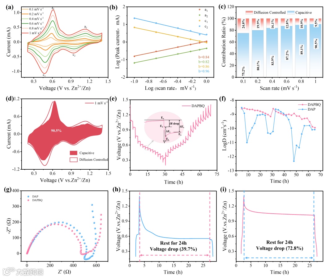 图3. (a)Zn//DAPBQ电池在不同扫描速率下的CV曲线;(b)DAPBQ的计算B值;(c)不同扫描速率下的计算电容/贡献比;(d)1 mV s-1下的电容贡献比;(e)Zn//DAPBQ电池在0.08 A g-1下的GITT测试;(f)Zn2+的计算离子扩散系数;(g)DAPBQ和DAP的EIS测试;以DAP(h)和DAPBQ(i)为正极的AZBs自放电性能研究。