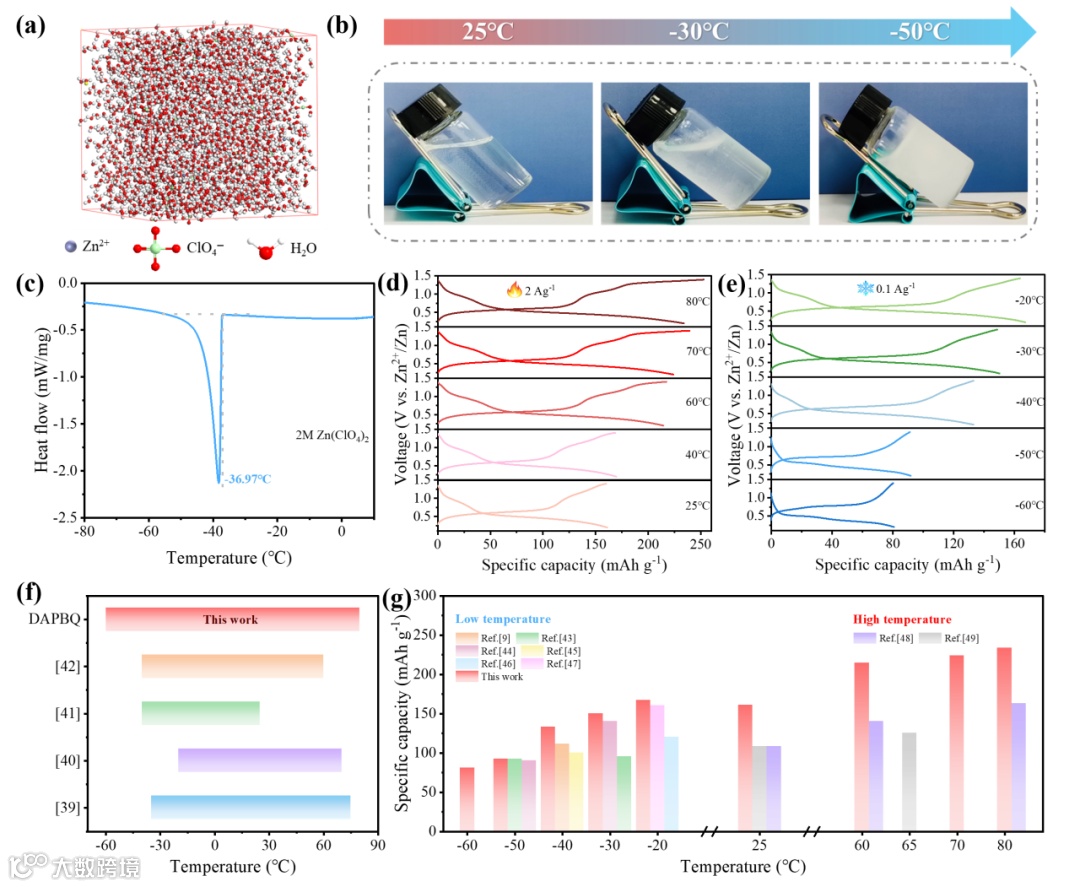 图5. (a)Zn(ClO4)2水溶液的MD模拟的快照;(b)Zn(ClO4)2电解质在25至-50 ℃温度范围内的数字照片;(c)Zn(ClO4)2电解质的DSC曲线;(d)2 A g-1,DAPBQ电极25至80 ℃温度范围内的高温性能;(e)0.1 A g-1,DAPBQ电极在-20至60 ℃温度范围内的低温性能;(f)宽温区不同有机正极的比较;(g)最近报道的不同有机正极的AZBs温度窗口的比容量比较。