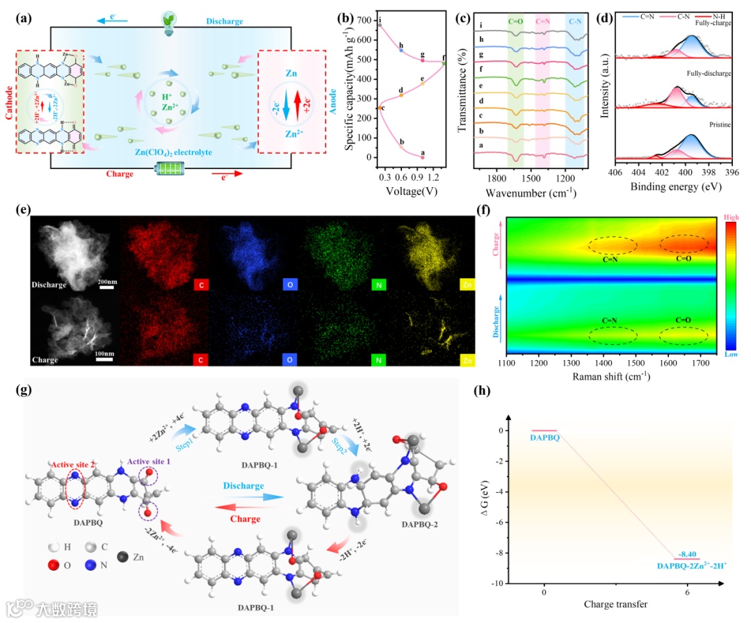 图4. (a)Zn//DAPBQ电池的离子储存示意图;(b)DAPBQ的充放电曲线;(c)DAPBQ电极在不同放电(0.2 V)/充电(1.4 V)状态下的非原位FTIR光谱;(d)完全放电(0.2 V)/充电(1.4 V)状态下的N 1s区域的非原位XPS光谱;(e)完全放电(0.2 V)/充电(1.4 V)状态下DAPBQ电极的C、O、N和Zn元素分布的TEM-EDS;(f)DAPBQ电极电化学过程中的原位Raman光谱;(g)放电/充电过程中DAPBQ的结构演变;(h)DAPBQ电极放电过程吉布斯自由能的变化。