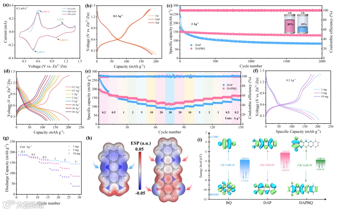 图2. (a)DAPBQ电极在0.2 mV s-1下的CV曲线;(b)Zn//DAPBQ电池在0.2 A g-1下的GCD曲线;(c)DAPBQ和DAP在2 A g-1下的循环稳定性;(d)Zn//DAPBQ电池在不同电流密度下的GCD曲线;(e)Zn//DAPBQ和Zn//DAP电池的倍率性能;(f)充电/放电曲线和(g)具有不同质量负载的DAPBQ的速率性能;(h)DAP和DAPBQ分子的表面静电势(ESP)分布图;(i)BQ、DAP和DAPBQ的最低未占据分子轨道(LUMO)/最高占据分子轨道(HOMO)分布图。