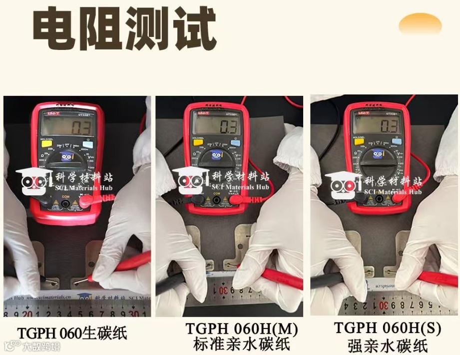 注2:亲水处理会导致基材(碳纸/碳布)的导电性,由科学材料站开发的亲水碳纸系列(如TGPH060H)和碳布系列(如W0S1011H)在经历数年的技术迭代后,已经可以在尽量不损失导电性的情况下增强其亲水性。