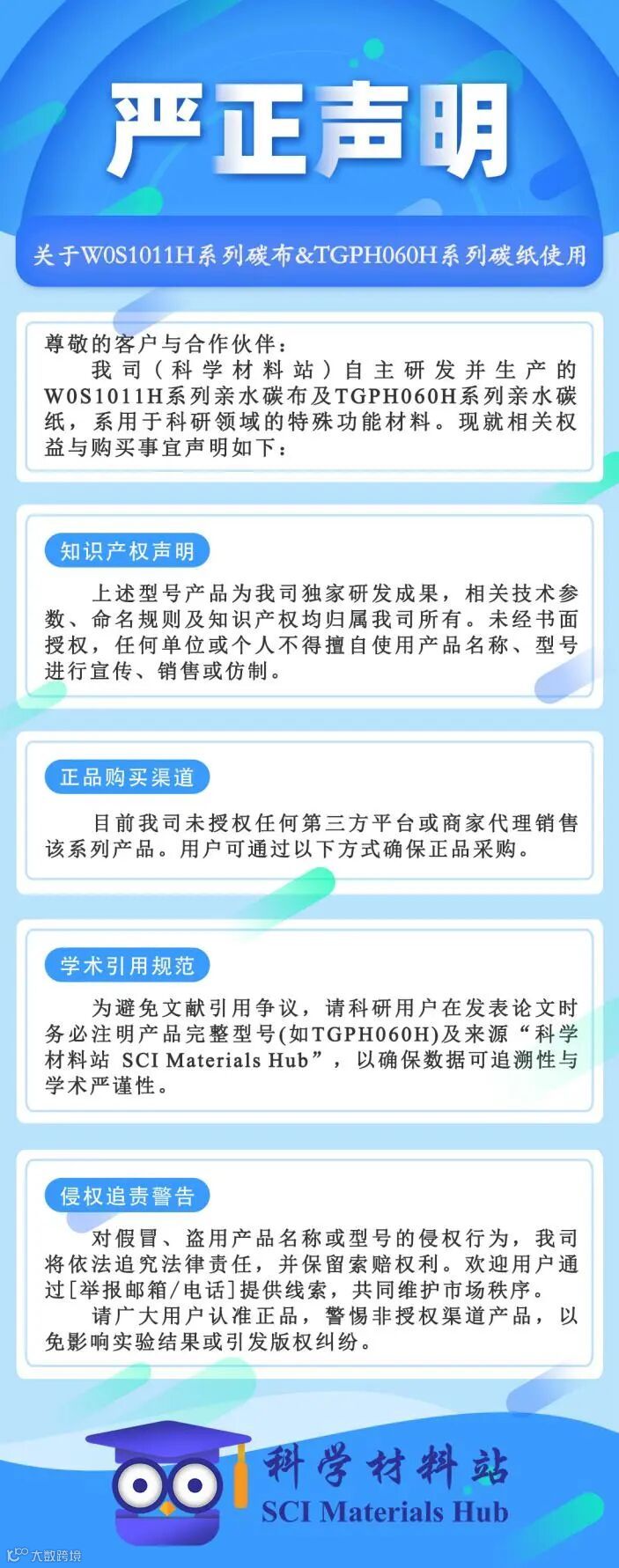 在此,我们郑重声明:我司未授权任何机构或个人代理销售亲水碳纸/碳布系列产品,所有官方渠道的产品均保持稳定的品质与性能。其它型号如W0S1011HS、TGP-H-060HS、TGP-H-060HG等均非我司产品,亦有直接使用我们的型号(如W0S1011H)进行销售的,请用户在选购时务必注意,以确保实验的可靠性、数据的可重复性及论文引用的真实性。如需确认产品来源或获得技术支持,请通过官方渠道与我们联系。感谢广大用户的信任与支持!