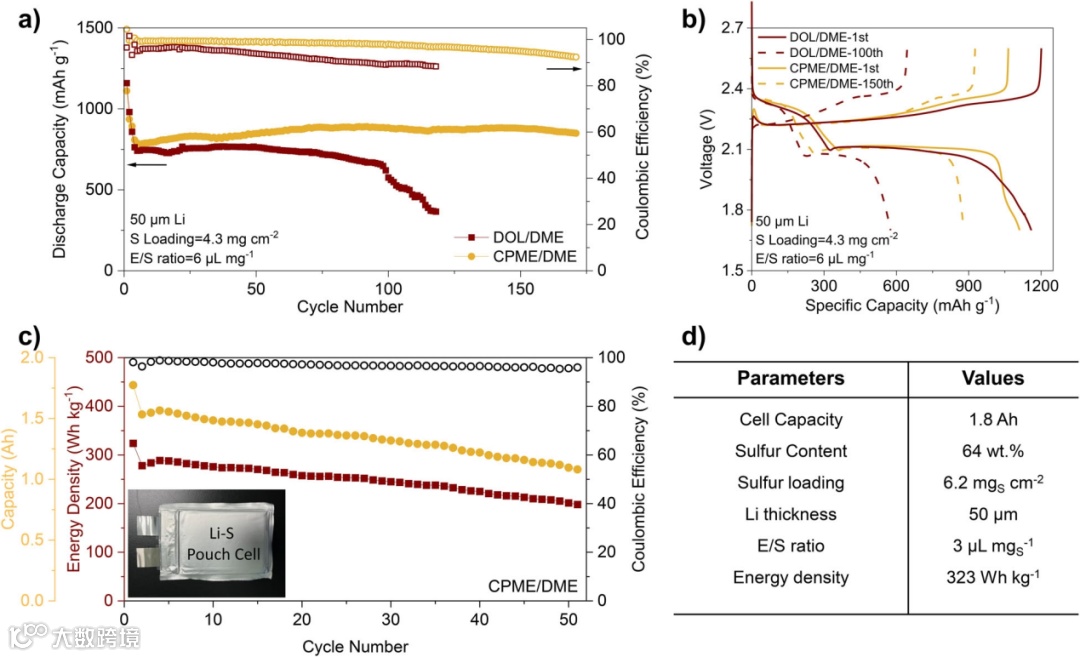 图6. Li-S软包电池的性能。a)具有CPME/DME与DOL/DME电解质的单层软包电池的0.05C循环性能。b)第1次和第150次循环的充放电曲线。c)使用CPME/DME电解质的1.8Ah软包电池的0.05C循环性能,以及d)相应的电池参数(插图:1.8Ah软包电池的光学图像)。