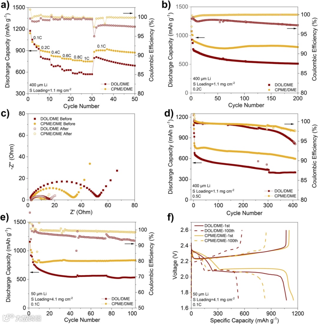 图3. 锂硫纽扣电池中的电化学性能。(a)CPME/DME和DOL/DME基电解液的倍率性能和(b)0.2C下的循环性能。(c)不同电解液在循环前和0.2C循环200圈后的EIS阻抗谱。(d)不同电解液在0.5C下的循环性能。(e)在苛刻条件下,不同电解液的锂硫纽扣电池的0.1C循环性能及(f)第1圈和100圈的充放电曲线。