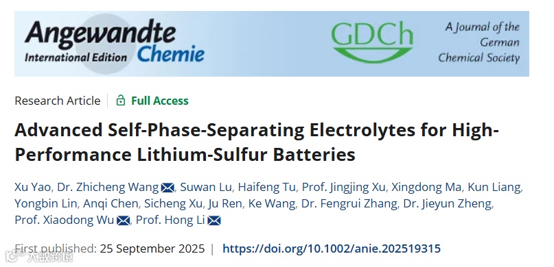 近日,中国科学院物理所/天目湖先进储能技术研究院李泓/王志诚&中国科学院苏州纳米所吴晓东团队合作,在国际知名期刊Angewandte Chemie International Edition上发表题为“Advanced Self-Phase-Separating Electrolytes for High-Performance Lithium-Sulfur Batteries”的文章。这项工作提出一种动态相分离电解质,为解决金属硫电池中快速硫转化动力学和稳定阳极界面行为之间的关键权衡问题提供了一种有效的解决方案。