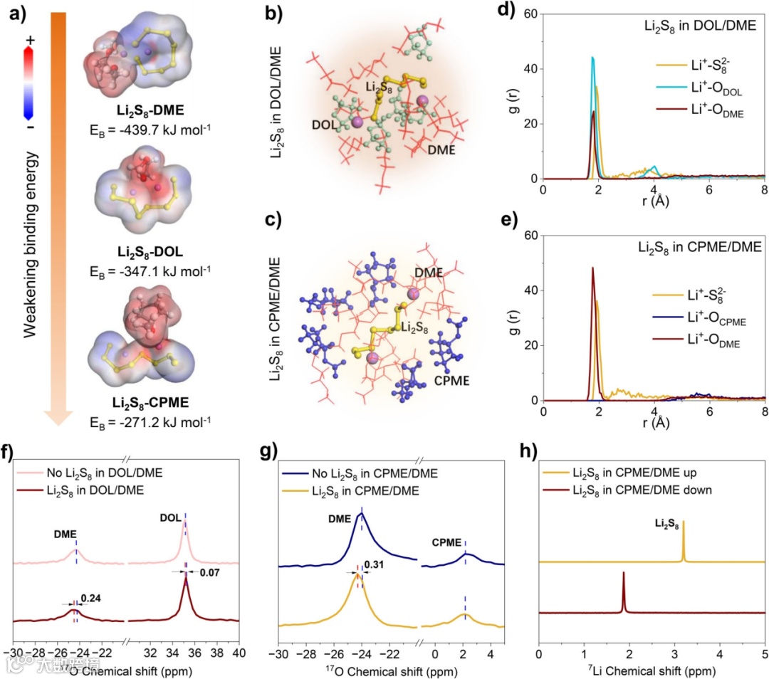 图2. 多硫化锂溶剂化结构。(a)基于DFT计算,不同溶剂分子与Li2S8之间的结合能和静电势。(b)DOL/DME电解质和(c)CPME/DME中S82-周围的分子分布快照。(d)DOL/DME电解质和(e)CPME/DME中Li+周围的RDF曲线。(f)不含Li2S8和含0.1M Li2S8的DOL/DME的17O-NMR光谱。(g)不含Li2S8和含0.1M Li2S8的CPME/DME的17O-NMR光谱。(h)CPME/DME溶解1M Li2S8后上层和下层的7Li-NMR光谱。