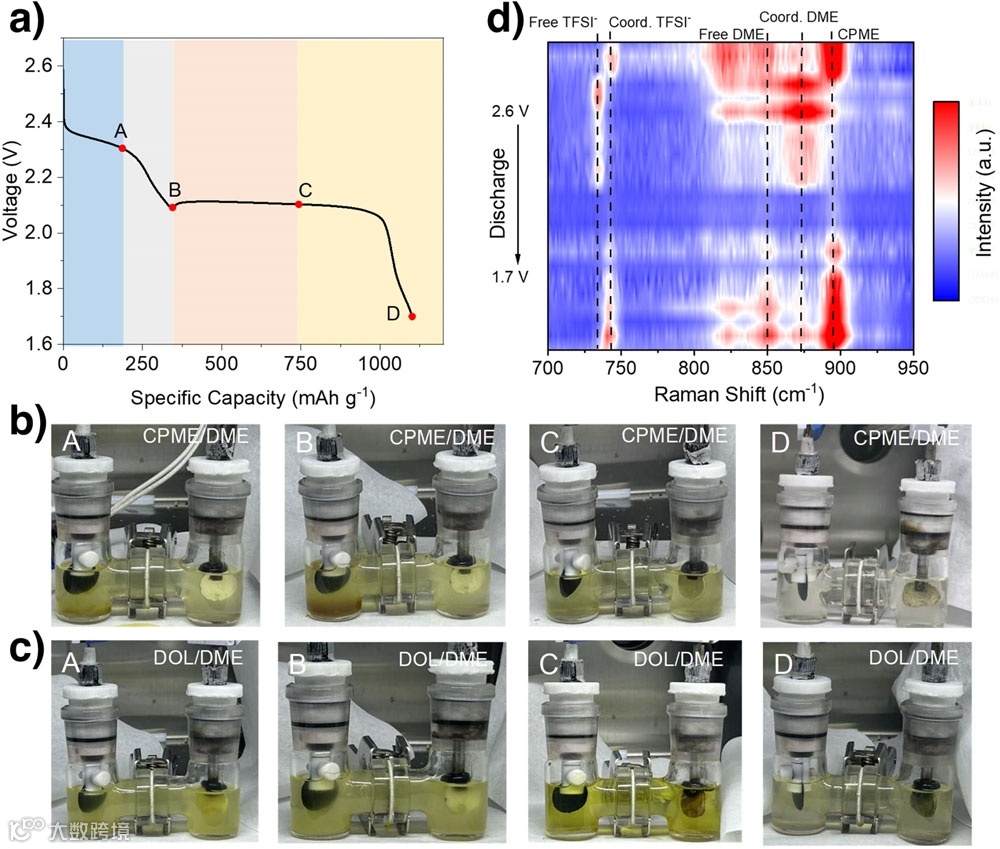 图5. 电池中电解质相分离行为的实时分析。a)使用CPME/DME电解质的Li-S电池的首次放电曲线和选定点。b)CPME/DME电解质和c)DOL/DME电解质在可见电池的相应放电状态下的照片。d)放电过程中Li-S电池S/C正极侧CPME/DME电解质的原位拉曼光谱。