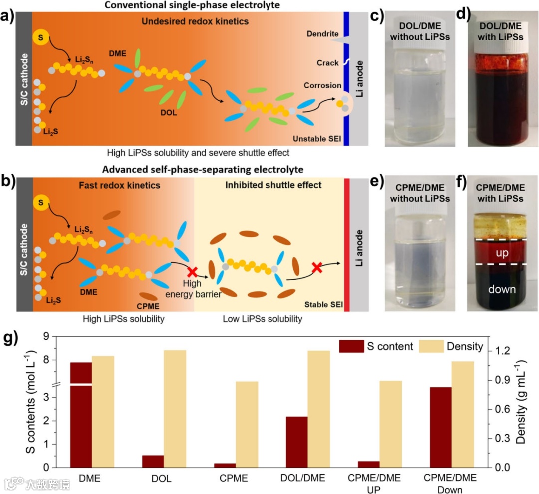 在传统的1,3-二氧戊环(DOL)/DME(1:1,v/v)溶剂中,该体系在饱和Li2S8溶解前后保持单一液相。而在CPME/DME(1:1,v/v)溶剂中,环戊基的空间位阻大大削弱了CPME分子的氧配位能力,降低了整体溶剂化能力。尽管引入CPME预计会降低多硫化物的溶解度,但实验表明,Li2S8溶解后溶解度没有显著降低,相反,会发生自发的液-液相分离,形成透明的浅红色上相和砖红色下相,密度结果表明其上层为CPME富集相,下层为DME富集相。