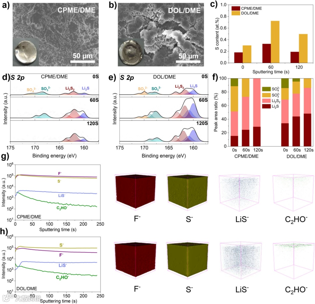 图4. Li-S电池中,不同电解质对锂金属的稳定性。a)在CPME/DME基电解液和b)DOL/DME基电解液中循环50次后,锂金属电极的SEM图像。(插图为光学图像)。c)通过XPS光谱获得的不同溅射时间下的原子S含量。d)CPME/DME和e)DOL/DME电解质中不同溅射时间下循环锂金属的S 2p XPS光谱。f)通过XPS光谱获得的不同溅射时间下硫物种的峰面积比。g)CPME/DME和h)DOL/DME电解质中循环锂金属上F−、LiS−、S−和C2HO−碎片的TOF-SIMS深度分布。