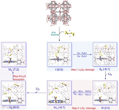 为深入探究多硫化物(LiPSs)在Fe-TCPP@Cu-BTC催化剂中的行为机制并验证研究假设,我们采用密度泛函理论(DFT)模拟完整再现了吸附-催化-脱附过程中的硫物种转化路径(如图4)。研究发现,Fe-TCPP@Cu-BTC中Cu-BTC组分富含的含氧官能团能在还原过程中与LiPSs中的Li形成Li-O键,这种强相互作用促使多硫化物在催化剂表面富集。在外加电场作用下,Cu-BTC组分可催化长链Li2S8转化为较短链的Li2S6,其缩减的分子尺寸更易进入Fe-TCPP@Cu-BTC的孔道结构。当Li2S6进入催化剂空腔后,其末端硫原子(ST)会分别与空间隔离的Cu和Fe位点(间距10 Å)配位,这种独特的空间排布既避免了Cu-Fe间的电子相互作用,又能同步形成独立的Cu-S和Fe-S键,从而高效促进Li2S6中S-S键的断裂。该结合过程释放27.0 kcal mol‒1的热量,表明Li2S6在空腔中的封装是热力学自发过程。通过对比初始态(I)与Li2S6中S-S键长的变化,我们发现Cu-S和Fe-S键产生的张力可诱导Li2S6通过三种路径(IIa、IIb、IIc)解离,分别生成Li-Sx-M(x=2,3,4)片段。其中均裂路径IIb(生成Li-S3-M)在热力学上显著优于异裂路径(相对I态能量变化:-9.1 vs. -1.2/11.0 kcal mol‒1),这与实验观测结果高度吻合。在持续Li+供给条件下,Li-S3-M中的S3单元会进一步解离为Sy和S3-y-M(y=1,2),产生游离的Li2S或Li2S2物种。相较于高能耗路径IVa(Li2S/LiS2-M,+61.0 kcal mol‒1)和IVb(Li2Sz/LiS3-z-M,+27.2 kcal mol‒1),低能垒路径IVc(Li2S2/LiS-M,+16.7 kcal mol‒1)和IVd(Li2Sz/LiS3-z-M,+17.2 kcal mol‒1)更易发生。最终在额外Li+辅助下,残留的S-M键可通过轻微吸热步骤(7.2 kcal mol‒1)完成解离,实现硫还原全过程。综合能垒分析表明,最优转化路径为I→IIb→III→IVc→Vc→VIc(图4)。特别值得注意的是,当Li2S6进入仿生酶空腔且Li2S脱附后,Fe-TCPP@Cu-BTC中Cu位点可通过H2O分子的电离吸附维持动态配位平衡,这既为后续硫转化提供活性位点,又确保了催化剂结构的稳定性。