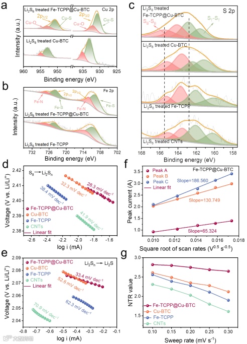 作者通过吸附实验揭示了Fe-TCPP@Cu-BTC催化剂与多硫化物的相互作用机制。静态吸附实验显示,Fe-TCPP@Cu-BTC对Li2S6的吸附能力最强。XPS分析证实了催化剂与多硫化物间形成了稳定的化学键合,其中Fe-TCPP@Cu-BTC的Cu-S键结合能负移3 eV,峰面积占比达96.7%;Fe-S键结合能负移0.5 eV,峰面积占比75.4%,表明其具有更强的电子转移能力(图5a-c)。电化学测试显示,Fe-TCPP@Cu-BTC电池在0.1 mV s‒1扫速下于2.31 V和2.05 V处出现明显还原峰,2.42 V处出现氧化峰,且Tafel斜率(28.3-43.7 mV dec‒1)显著低于对照组,证实其优异的反应动力学(图5d,e)。Fe-TCPP@Cu-BTC的锂离子扩散系数(3.24×10‒9 - 2.65×10‒8 cm2 s‒1)也明显优于其他样品(图5f)。这些结果共同表明Fe-TCPP@Cu-BTC通过Li键与M-S键的协同作用,实现了多硫化物的高效转化和穿梭效应的有效抑制。通过成核转移数(NTR)来评估正极反应的动力学行为。在不同扫描速率下,Fe-TCPP@Cu-BTC 电池的所有NTR值都接近3,这表明 Fe-TCPP@Cu-BTC促进了LiPSs向Li2S的快速转变(图5g)。