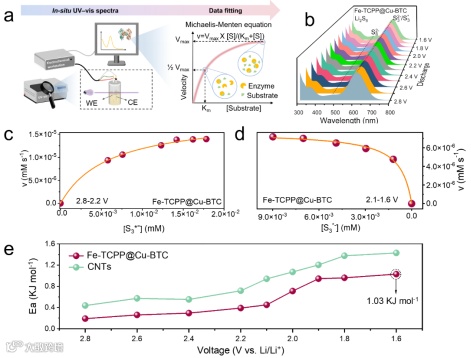 为阐明Fe-TCPP@Cu-BTC的仿酶催化特性与其结构仿生特征之间的构效关系,作者通过原位紫外-可见光谱技术,在固定催化剂浓度条件下系统改变S3‒浓度进行了稳态动力学分析。实验数据显示,在整个放电过程中(图3a-d),该催化体系严格遵循经典的米氏动力学模型。通过米氏方程拟合获得了关键酶动力学参数:米氏常数(Km)反映仿生酶对底物的亲和力(Km值越低亲和力越高),而Vmax则表征催化活性。相较于Cu-BTC(2.5-2.2 V电压区间Km=1.02×10‒3 mM)和Fe-TCPP(2.1-1.6 V区间Km=3.89×10‒2 mM),Fe-TCPP@Cu-BTC在整个硫转化区间均表现出更低的Km值(2.8-2.2 V区间Km=5.92×10‒3 mM;2.1-1.6 V区间Km=7.79×10‒4 mM),表明其对硫物种具有更强的亲和力。而CNTs体系完全不遵循该动力学规律。进一步分析最大反应速率Vmax发现,Fe-TCPP@Cu-BTC在2.8-2.2 V区间的Vmax达5.87×10‒4 mM min‒1,较Fe-TCPP(8.47×10‒6 mM min‒1)和Cu-BTC(1.24×10‒6 mM min‒1)提升了近两个数量级,证实该结构仿生催化剂通过促进多硫化物解离使硫转化效率提高约100倍。整个硫转化过程可分为两个典型阶段:第一阶段(2.8-2.2 V)实现Li2S8向LiS3的转化,伴随S3‒浓度逐渐升高至2.2 V达到峰值;第二阶段(2.1-1.6 V)完成LiS3向Li2S的转化,S3‒作为关键中间体被逐步消耗。这种分阶段建模方法基于各电压区间S3‒物种的浓度分布特征,更精准地捕捉了反应动态过程,与酶催化中反应速率依赖于中间体浓度及其时变转化的特性高度吻合。为深入揭示硫氧化还原反应的动力学改善机制,我们通过电化学阻抗谱(EIS)计算了特定电压下的活化能(Ea, 图3e)。在2.4-1.6 V电压范围内,Fe-TCPP@Cu-BTC电池的Ea值(0.29-1.03 eV)显著低于Cu-BTC(0.34-1.20 eV)、Fe-TCPP(0.38-1.25 eV)和CNTs(0.55-1.42 eV)体系,这从能量角度证实了该催化剂对长链和短链多硫化物的高效催化转化能力。