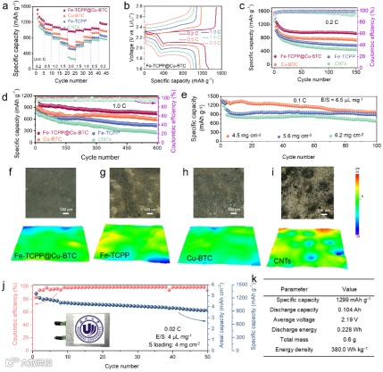 倍率性能测试表明,Fe-TCPP@Cu-BTC电池在0.2、0.5、1.0、1.5和2.0 C倍率下分别展现出1522、1162、1079、1024和970 mAh g‒1的优异放电容量(图7a)。当倍率重新降至1.5、1.0、0.5和0.2 C时,可逆容量分别恢复到1000、1023、1054和1189 mAh g‒1。相比之下,对照电池在倍率变化时表现出明显的容量波动和衰减趋势。Fe-TCPP@Cu-BTC电池的优异性能表明其具有快速的电子转移和高效的动力学反应过程。恒流充放电曲线(图7b)显示,随着倍率从0.2 C增至2.0 C,Fe-TCPP@Cu-BTC电极的极化仅轻微增加。这种较低的过电位、优异的倍率性能和高度可逆性源于改善的电化学动力学。长期循环性能测试显示(图7c),Fe-TCPP@Cu-BTC电池在0.2 C倍率下的初始放电容量高达1548 mAh g-‒1,150次循环后仍保持935 mAh g‒1。而对照组(Cu-BTC、Fe-TCPP和CNTs)的初始容量分别为1406、1395和1298 mAh g‒1,150次循环后容量分别降至733、574和448 mAh g‒1。在1.0 C倍率下(图7d),Fe-TCPP@Cu-BTC电池展现出最优异的容量保持率(初始容量1016 mAh g‒1,600次循环后751 mAh g‒1)和最低的容量衰减率(每循环0.043%),显著优于Cu-BTC(0.056%)、Fe-TCPP(0.075%)和CNTs(0.111%)。在高硫载量(4.5、5.6和6.2 mg cm‒2)和贫电解液(E/S比=6.5 μL mg‒1)条件下(图7e),初始放电容量分别为1350、1296和1280 mAh g‒1,100次循环后分别保持在976、885和682 mAh g‒1。循环600次后对锂负极的形貌分析显示(图7f-i),Fe-TCPP@Cu-BTC电池的锂负极表面保持金属光泽且平整,而对照组(Fe-TCPP、Cu-BTC和CNTs)则出现粗糙的钝化层和明显的锂枝晶,这归因于多硫化物与锂负极的副反应。软包电池测试(图7j)进一步验证了Fe-TCPP@Cu-BTC的稳定效果:在4.0 mg cm‒2硫载量和4 μL mg‒1 E/S比条件下,初始放电容量达5.2 mAh cm‒2(1435 mAh g‒2),50次循环后仍保持在3.7 mAh cm‒2(986 mAh g‒1)以上。首圈放电参数(图7k)显示:比容量1299 mAh g‒1,总放电容量0.104 Ah,平均电压2.19 V,放电能量0.228 Wh,实际能量密度高达380.5 Wh kg‒2,显著优于目前报道的双原子催化剂。