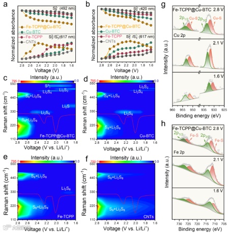 原位拉曼光谱进一步揭示了Fe-TCPP@Cu-BTC对硫转化的催化机制(图6c-f)。无催化剂时,仅观察到S8/Li2S8峰(152、246、437、472 cm‒1),且放电至1.6 V仍存在,表明硫还原不完全。而Fe-TCPP@Cu-BTC使S8/Li2S8峰强度逐渐降低:2.5 V时出现S62-(325 cm‒1)和S42-(496 cm‒1)峰;2.0 V时Li2S6消失,出现少量S32-/S3*-(534 cm‒1)和Li2S2(510 cm‒1);1.6 V时生成Li2S2和Li2S(375 cm‒1),表明S8/Li2S8完全转化。Cu-BTC电池的硫物种转化较慢(图6d),而Fe-TCPP电池仅检测到S8/Li2S8消失和Li2S6生成(图6e)。这些结果与DFT计算结果(图3)一致,证实Fe-TCPP@Cu-BTC通过均裂途径促进硫还原。半原位XPS分析(图6g-h)显示,Fe-TCPP@Cu-BTC电池中Cu 2p和Fe 2p的结合能在放电过程中持续负移,这种结合能负移表明Cu-S和Fe-S键的电子云密度增加,有效促进了S-S键断裂,进一步证实Fe-TCPP@Cu-BTC的双金属协同催化作用。