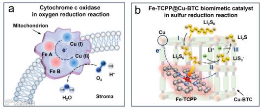 图1. 受细胞色素c氧化酶催化结构启发的用于锂硫电池的Fe-TCPP@Cu-BTC类酶催化剂设计。