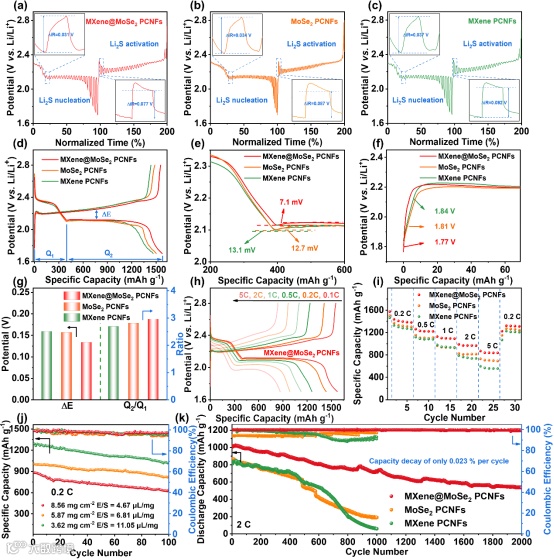 图7 a-c) GITT曲线; d) 0.1 C下MXene PCNFs、MoSe2 PCNFs和MXene@MoSe2 PCNFs的充放电曲线; e,f) CD曲线得到的放大图; g) ΔE和从充放电曲线得到的Q2/Q1值; h) MXene@MoSe2 PCNFs在不同速率下的充放电曲线; i) MXene PCNFs、MoSe2 PCNFs和MXene@MoSe2 PCNFs的倍率性能;j)高硫负载下MXene@MoSe2 PCNFs的循环性能; k) 2 C下的长循环性能。