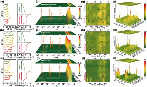图3 a-c)放电和充电时的原位EIS图; d-f) DRT拟合图; g-i) 原位拉曼的等高线图;j -l)不同放电/充电电压状态下的原位拉曼图。