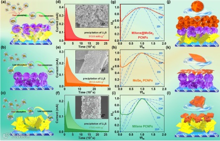 图2 a)不同材料性质的示意图; d) MXene@MoSe2 PCNFs, e) MoSe2 PCNFs, f) MXene PCNFs的Li2S沉积曲线; g) MXene@MoSe2 PCNFs, h) MoSe2 PCNFs, i) MXene PCNFs的无量纲拟合图; j-l)不同材料的Li2S沉积形貌示意图。