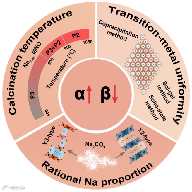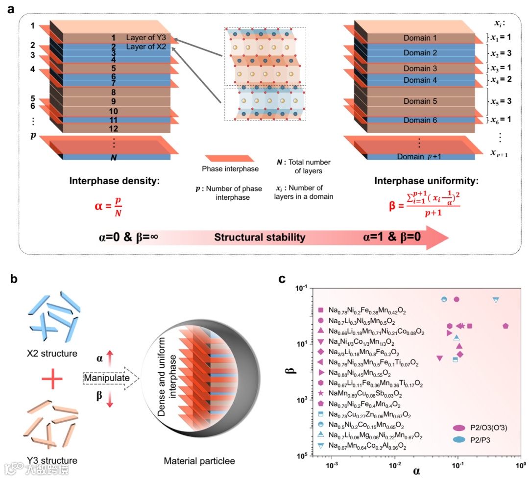 最近,多相结构设计被广发报道,研究者发现,相比于纯相材料多相材料普遍在结构稳定性方面有所提升。但是,各报道提升效果不一,背后的作用机理也不明确。对此,该文章阐述了多相结构相界面稳定层滑移的机制,提出了有效的相界面工程设计原则(X2/Y3组合,界面密度α,界面均匀度β),并基于此制备了具有相变和循环改善的P2/P3-Na0.46Mn0.9Ni0.1O2钠电正极。最后,通过拓展实验进一步验证了该界面工程的普适性。
