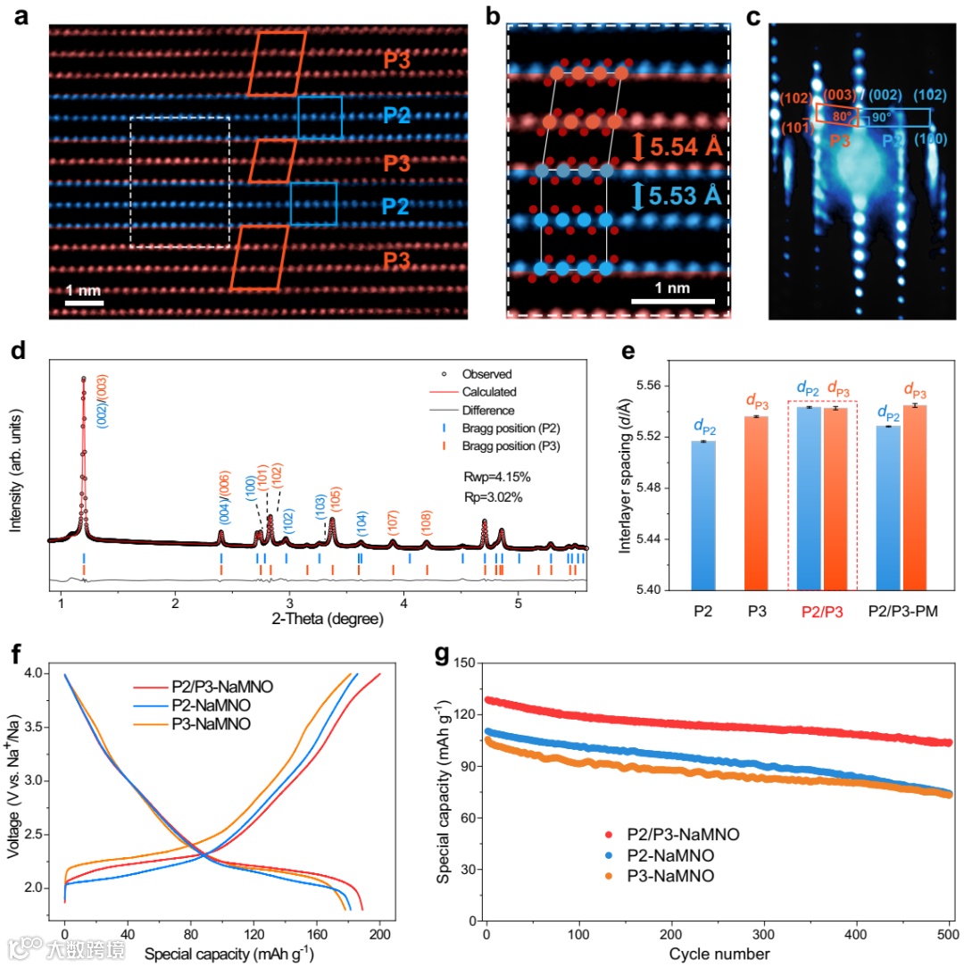 要点三:成功合成高质量P2/P3界面材料P2/P3-Na0.46Mn0.9Ni0.1O2,验证了界面滑移抑制作用