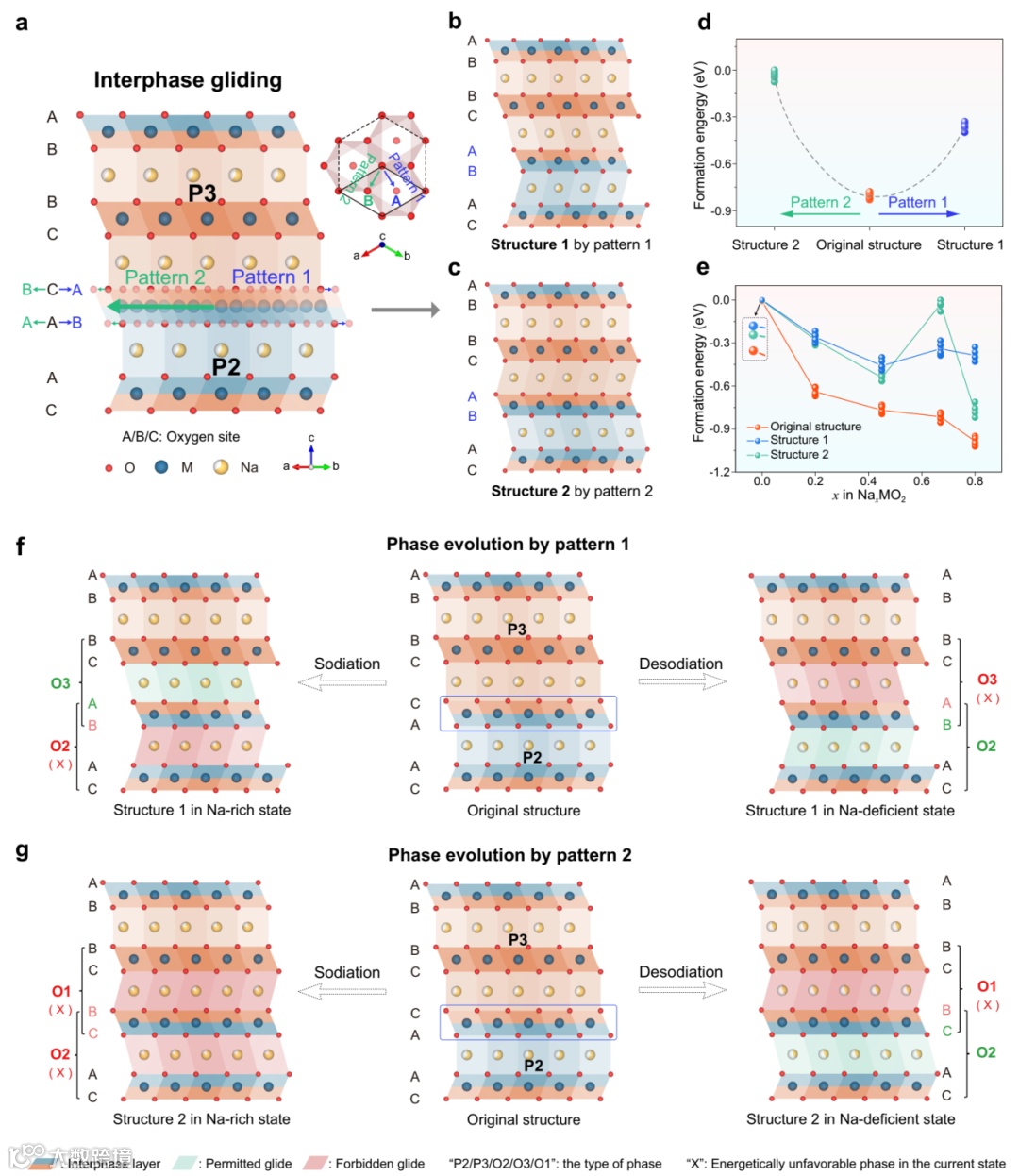 作者先以P2+P3双相结构为例,在一个晶胞尺度下构建了P2/P3界面模型,并推演了该界面的滑移情况。通过DFT计算发现,界面MO2层滑移产生的两种新结构会使系统能量升高。进一步的,作者从相结构层面推演分析发现,在电化学过程中P2/P3界面的滑移始终会导致界面其中一侧的相结构变为热力学不稳定的相(例如富钠的O2相),因此在电化学过程中该界面趋于保持原位静止,以维持系统能量最低。紧接着,作者用同样的方法逐一分析了剩余的相界面组合(P2/O3, P3/O2,P3/O3,O2/O3),结果表明,只有符合X2/Y3(X、Y = P或O)组合的相界面才能抑制滑移。