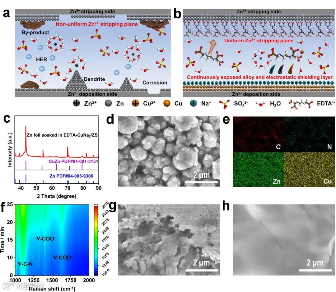 首先研究了锌箔在EDTA-CuNa2/ZnSO4电解质中浸泡4小时的界面演变。XRD, SEM和EDS图谱等表征证明,加入添加剂后,锌负极表面形成了均匀致密的ZnCu合金层(图1c-e)。原位拉曼检测证实,带负电的 EDTA4-分子在电场驱动下迁移至Zn2+剥离电极并逐渐形成分子层(图1f)。为了进一步验证 EDTA4-保护层在维持电极剥离过程表面完整性方面的作用,借助SEM对比了分别在EDTA-CuNa2/ZnSO4(EDTA-CuNa2/ZS)电解质和ZnSO4(ZS)电解质中完成剥离的锌电极的表面形貌,其直观地证明了EDTA-CuNa2添加剂对剥离过程的有效调节作用(图1g和h)。