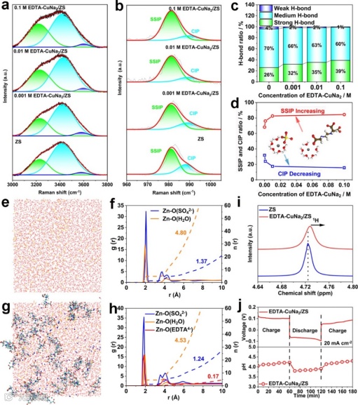 此外,EDTA-CuNa2还能有效地调节硫酸锌电解质中Zn2+的溶剂化结构,拉曼光谱分析证实随着EDTA-CuNa2的浓度升高,电解液中强氢键比例明显升高,接触离子对(CIP)比例升高,而溶剂分离离子对(SSIP)的比例降低(图2a-d)。分子动力学(MD)模拟揭示,与 ZS 电解质相比,EDTA-CuNa2/ZS 电解质不仅有两个分别属于Zn-O(H2O)和Zn-O(SO42-) 的强烈分布峰,而且还额外有一个归属于Zn-O(EDTA4-)的强烈分布峰(图2e-h),而且EDTA-CuNa2/ZS 电解质中的Zn-O(H2O) 和 Zn-O(SO42-) 的配位数相较于ZS电解质中有明显降低。这些表征和理论模拟结果证实EDTA-CuNa2添加剂显著改善了锌离子的溶剂化结构, EDTA4-的竞争性配位作用减弱了水分子和SO42-的与Zn的配位作用。核磁共振(NMR)表征进一步进一步证明添加EDTA-CuNa2能够增强质子的去屏蔽效应并破坏水的氢键网络,从而降低水的活性(图2i)。在 20 mA cm-2/20 mAh cm-2 的充放电循环过程中,对两种电解质体系进行的原位 pH 监测进一步证实了EDTA-CuNa2引起的水活性降低(图2j)。