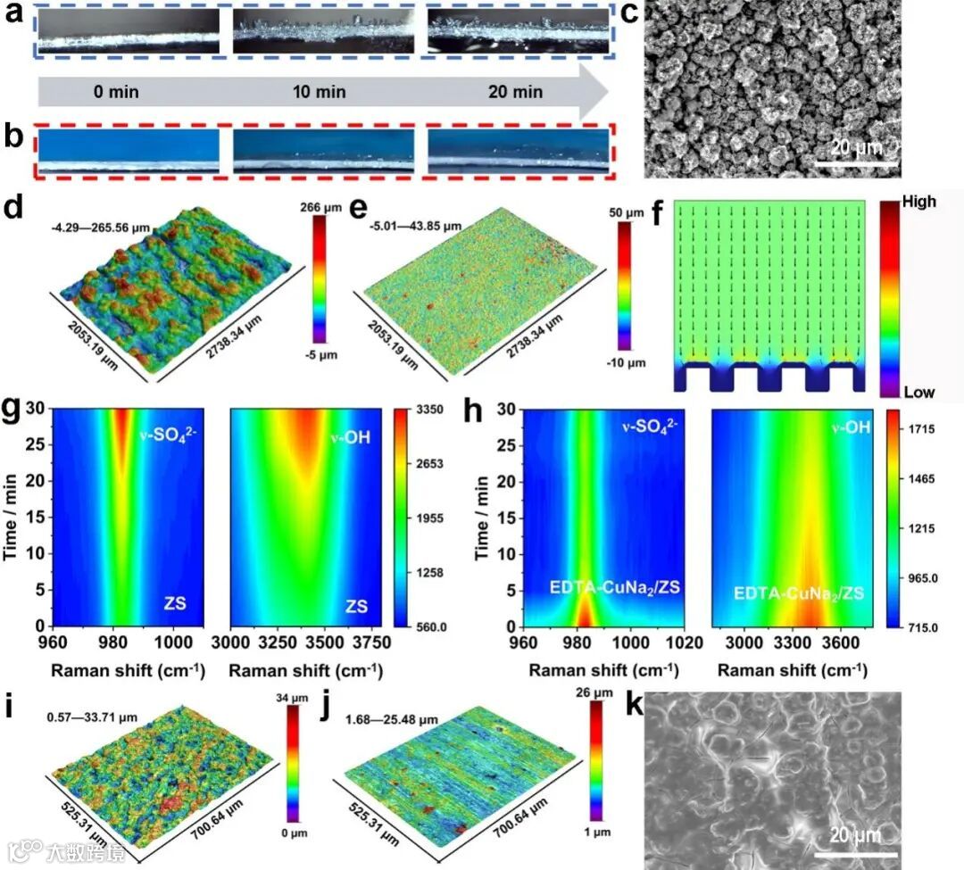 这种均匀的界面电场分布有效地促进了Zn2+的均匀沉积,从而抑制锌枝晶,得到了更为平整的电极表面。进一步,原位拉曼光谱分析动态追踪了在两种不同电解液中Zn2+沉积电极表面的SO42-和活性水分子浓度随时间的变化情况,实验结果证实在EDTA-CuNa2/ZS电解质中的Zn2+沉积电极表面附近的SO42-和活性水分子随时间逐渐减少 (图3g和h)。这主要是得益于EDTA4-诱导的水合锌离子的脱附以及钠离子静电屏蔽层的阻挡效应。通过防止SO42-和活性水分子与电极表面的直接接触,有效地避免了有害的副反应的发生,得到了无枝晶的平坦Zn2+沉积电极。同时,对循环后的Zn2+剥离电极形貌进行了LSCM和SEM表征,进一步证明了EDTA-CuNa2添加剂对剥离电极表面形貌的优化作用(图3i-k)。通过一系列原位和非原位表征充分证实了EDTA-CuNa2添加剂对锌负极表面Zn2+沉积/剥离形貌的有效调节作用。