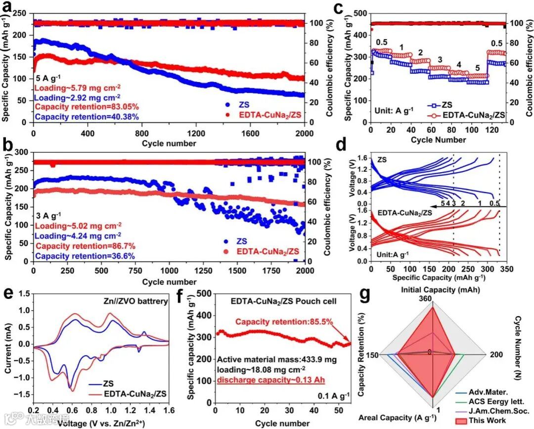 应用EDTA-CuNa2/ZS电解质组装的ZnxV2O5·nH2O||Zn全电池(ZVO||Zn-ECN/Z全电池)在高负载量(5.79 mg / cm-2)及大电流密度(5 A g-1)下稳定循环2000次后,容量保持率为83.05%,在更低的电流密度(3 A g-1)下,也表现出比应用ZS电解质组装的ZVO||Zn全电池(ZVO||Zn-Z全电池)更出色的循环性能,在 2000次稳定的充放电循环后,其容量保持率高达86.7%(图5a和b)。此外,ZVO||Zn-ECN/Z全电池的倍率性能明显优于ZVO||Zn-Z全电池,其在0.5、1、2、3、4和5 A g-1下都具有更高的放电比容量(图5c和d)。应用EDTA-CuNa2/ZS电解质的软包电池具有0.13Ah的超高放电容量。综上,EDTA-CuNa2作为一种多功能电解质添加剂对扣式和软包ZVO||Zn全电池都表现出显著的改善效果,显示出巨大的实际应用潜力。