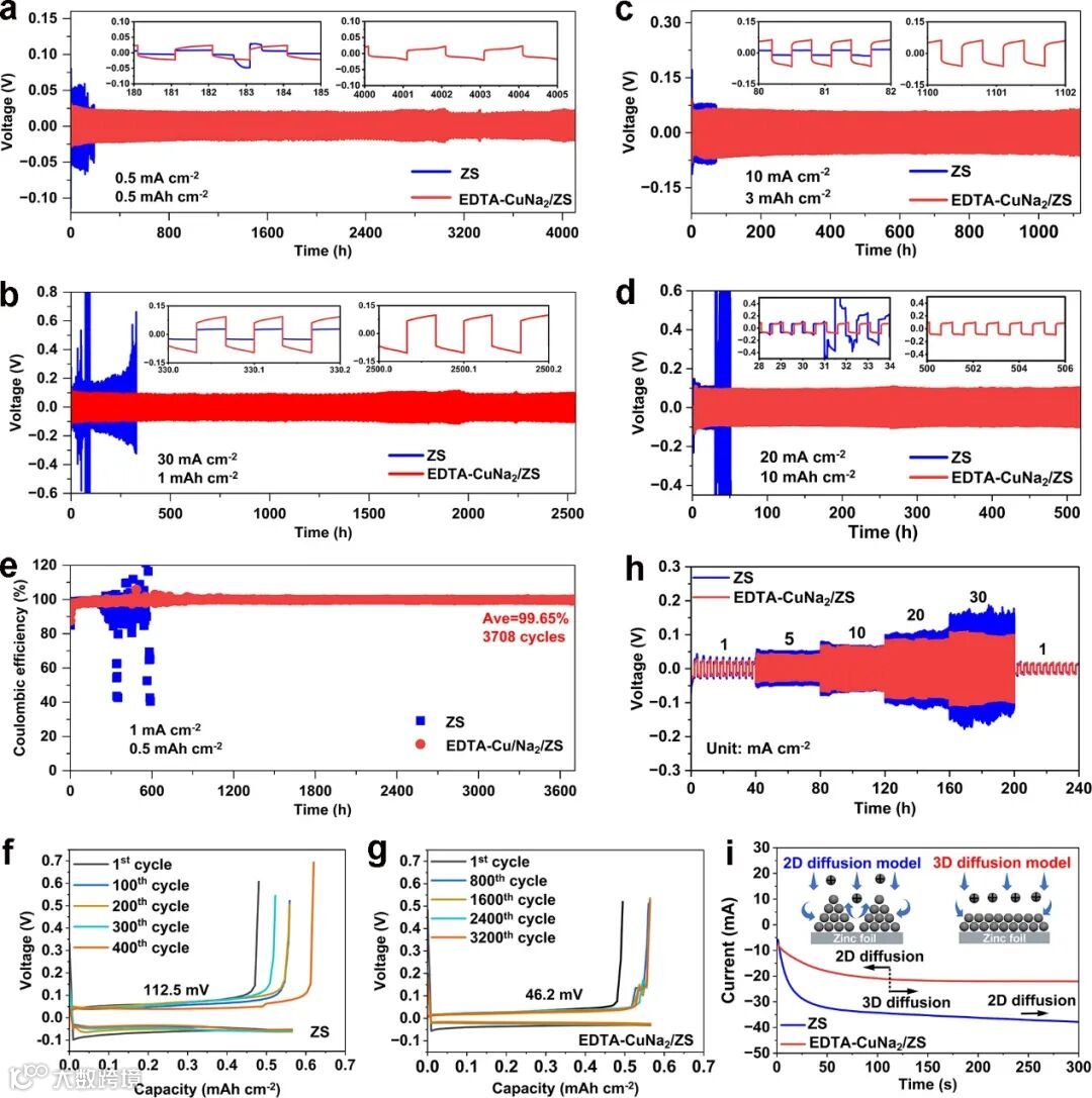引入EDTA-CuNa2添加剂后的Zn||Zn对称电池在0.5 mA cm-2/0.5 mAh cm-2的电流密度和容量条件下,实现了超过 4100 小时的稳定循环,循环周期超过 171 天(图4a)。在30 mA cm-2/1 mAh cm-2的大电流密度下,Zn||Zn对称电池仍稳定性循环超过2500小时(图4b)。而且,采用EDTA-CuNa2/ZS电解质的Zn||Cu半电池在1 mA cm-2/0.5 mAh cm-2条件下可稳定沉积-剥离超过3700次,库仑效率高达99.65%,远优于应用ZS电解质的Zn||Cu半电池(图4e)。因此,EDTA-CuNa2添加剂的引入,持续暴露的亲锌合金位点,促进了锌离子的传输动力学,同时,EDTA4-对剥离过程进行有效调节,在双重调节作用下,有效提高了AZIBs的循环稳定性。