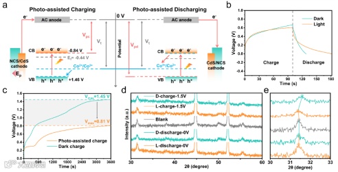 基于上述研究结果,我们提出了光对器件在充放电过程的内在影响机制。传统超级电容器中Ni2+/Ni3+和Co2+/Co3+的理论氧化还原电位范围在1.2至1.4伏之间。然而在集成式光超级电容器中,由于存在CdS,光激发电子能够从价带(VB)跃迁至更高能级的导带(CB)。其电势显著低于NiCo2S4,这些高能电子可有效促进法拉第反应。在光辅助放电过程中,储存在活性炭负极中的电子通过外部电路流入正极价带,导致光放电电压(Vpd)超过理论放电电压(Vt),如图5a-b所示。图5c为对比光照和黑暗条件下3600秒的充电曲线,发现黑暗条件下的充电电压比光照条件下高约640mV。这说明了低功耗光辅助充电的可行性。在不同阶段的光照和黑暗条件下,对光电阴极进行了非原位XRD检验(图5d-e)。结果表明光产生的空穴促进了羟基与NiCo2S4的氧化,从而使更多的羟基渗入晶格,导致晶格膨胀。同样,在黑暗中充电时,特征峰会向更大的角度移动,这表明不可逆金属离子脱离了材料表面。