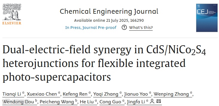 近日,来自南京信息工程大学的李敬发教授,在国际知名期刊Chemical Engineering Journal上发表题为“Dual-Electric-Field synergy in CdS/NiCo2S4 heterojunctions for flexible integrated photo-supercapacitors”的研究文章。该文章通过相控硫化技术实现了分层CdS/NiCo2S4异质结的界面工程设计,构建了矢量电荷传输通道,使集成光超级电容器兼具光活性与储能双重功能,如图1所示。理论计算和光电化学测试表明,引入CdS层可显著提升NiCo2S4的光导性能,其光生电场与金属半导体协同电场共同作用,促进了光生载流子的分离传输。同时,光激发产生的高能电子-空穴对加速了电极反应动力学进程,加快了双电层界面的形成。该柔性集成光超级电容器在光照条件下展现出高达95.6 Wh/kg的功率密度和2868 W/kg的高能量密度,且保持优异的长期光敏性,间歇光照下容量提升约40%。