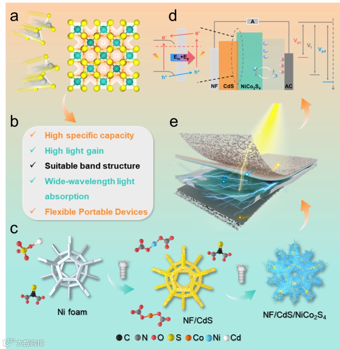 图1. 集成式光超级电容器的设计概念。(a)NiCo2S4与CdS的晶体结构。(b)基于CdS/NiCo2S4异质结光电阴极的典型优势。(c)泡沫镍基底上NiCo2S4在CdS上的原位生长示意图。(d-e)NF/CdS/NiCo2S4柔性光辅助充电装置及其基于双电场协同过程的光电荷特性。
