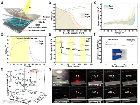 为了进一步研究CdS/NiCo2S4阴极的实用性,我们利用聚丙烯酸凝胶电解质组装了一个柔性集成光超级电容器,以展示其在光电转换和储能方面的性能(图3a)。如图3b所示,柔性集成光超级电容器在光照下的放电比容量为400.8 F g-1,比黑暗条件下的比容量(276 F g-1)高出约45.2 %。同样,与黑暗条件下相比,光照下的CV面积也有明显改善。光照下的明显增强(图3c)证实了光生载流子很好地参与了整个充放电过程。图3d展示了定时恒流光辅助充电的光辅助放电性能。如图3e所示,柔性集成光超级电容器的在50次光暗交替超过300次的情况下表现出优异的瞬时光增强和光增强容量保持能力。为测试其灵活性,将角度调整为0°、60°和150°,集成光超级电容器在功率密度为5000 W kg-1 时的能量密度变化曲线显示,其电化学性能保持不变(图3f)。根据计算,柔性集成光超级电容器在光照条件下的最大能量密度为95.6 Wh kg-1,相当于功率密度2868 W kg-1。如图3g所示,包括能量密度、功率密度和光增益率在内的电化学性能均优于最新报告。这种光增益行为也可通过两个串联点亮二极管的=柔性集成光超级电容器进行跟踪。如图3h所示,在黑暗中充电的柔性集成光超级电容器只能点亮二极管420秒。相反,在光照下充电后的柔性IPSC可以持续点亮灯泡600秒以上,并且二极管显示更高的亮度。这表明柔性集成光超级电容器通过将光子转化为电能,有效地储存了更多电荷。