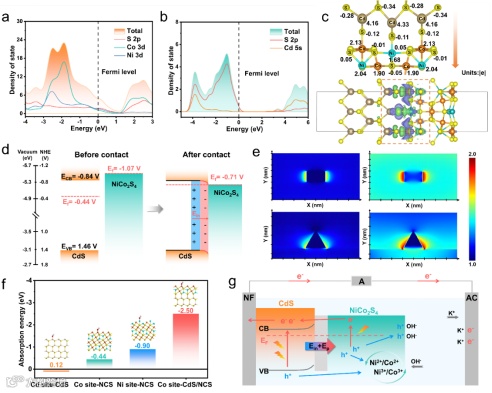 通过密度泛函理论(DFT)计算了CdS和NiCo2S4的态密度,结果表明NiCo2S4的类金属性质(图4a-b)。如图4c所示,在CdS和NiCo2S4之间形成异质结的驱动下,电子发生重组,并优先聚集在硫原子位点的外围。Bader电荷分析和电荷密度差证实了CdS域的电子耗尽(紫色区域),同时显示了NiCo2S4的电子聚集(绿色区域);同时,从CdS到NiCo2S4的界面电荷转移的逐步积累建立了连续的表面电势梯度,从而产生了从CdS侧到NiCo2S4侧的内置电场。伴随着CdS的能带弯曲,在界面上形成了内置电场(图4d)。如图4e显示,局部电场主要集中在NiCo2S4和CdS的界面上。然而,随着入射光波长的增加,电场强度显著增强。这表明局部电场有助于载流子分离,从而提高了光生载流子在界面上的分离效率。此外,根据DFT方法计算了不同的吸附构型,计算结果表明CdS/NiCo2S4复合材料同羟基具有最强的相互作用。通过将实验结果与理论分析相结合,如图4g我们概述了基于CdS/NiCo2S4阴极的集成式光超级电容器充电可能涉及的机理
